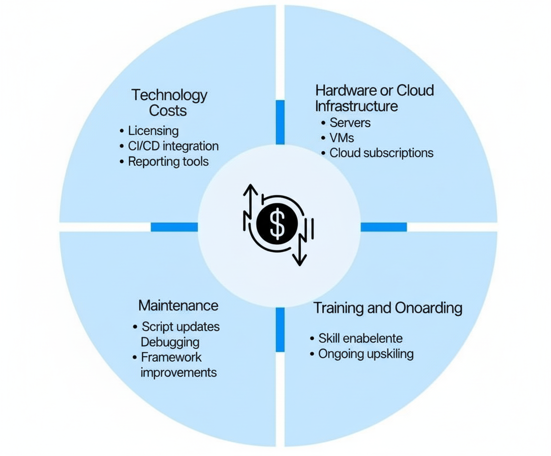 Technology costs may also include supporting solutions such as code repositories for managing automation scripts, CI/CD integrations for continuous test execution, and reporting tools that deliver testing insights. Neglecting these related expenditures often results in an incomplete understanding of total investment.Â